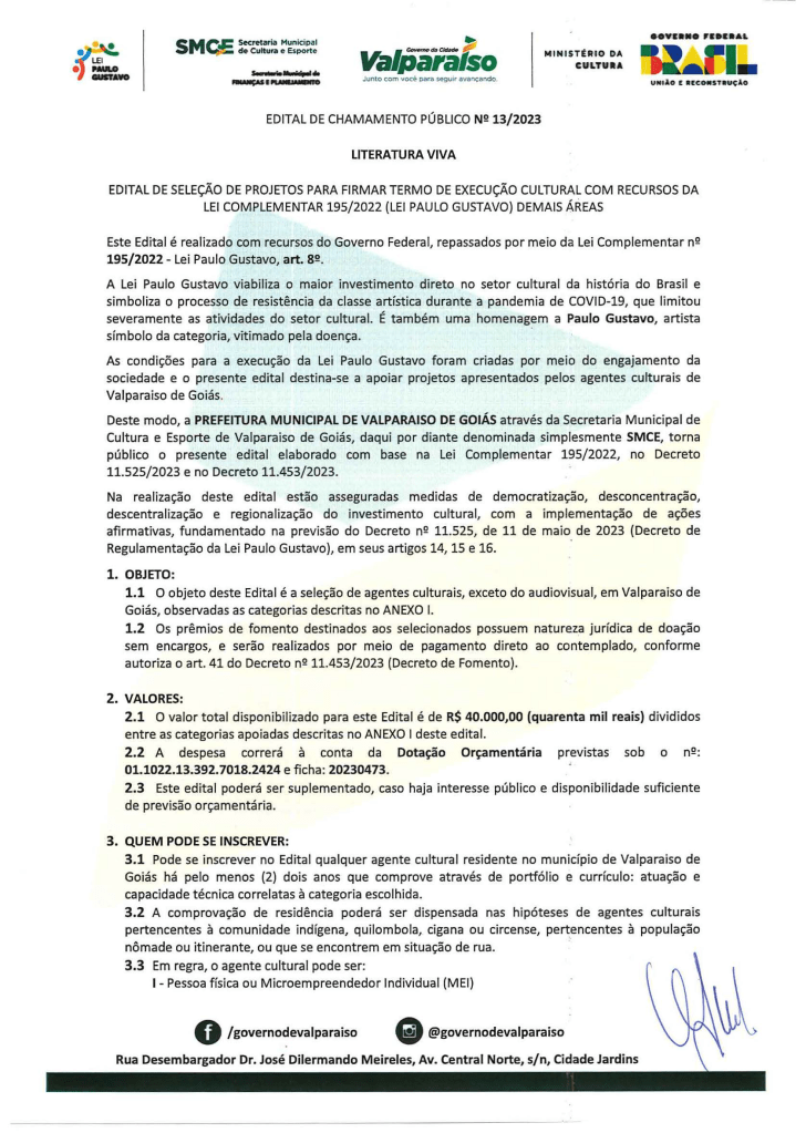 O “Edital de Chamamento Público Nº 13/2023 Literatura Viva” é um programa de fomento cultural da Prefeitura Municipal de Valparaiso de Goiás através da SMCE, focado em projetos literários. É financiado pela Lei Complementar nº 195/2022 (Lei Paulo Gustavo) e destina R$ 40.000,00 para diferentes categorias literárias, incluindo literatura fantástica e publicações diversas.