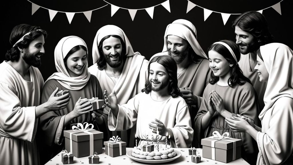 Um dia, o pai lhe pediu que lhe acompanhasse cedo em uma entrega, levaram uma mesa na carroça puxado pelos burros, Jesus ajudou sem pestanejar, durante a caminhada viu muitas pessoas pobres pedindo qualquer ajuda. Seu pai estendia a mão e dava um pedaço do seu almoço, um pão que levara na bolsa. Todos podem aprender coisas boas, mas o bom exemplo ensina com valor. Chegando em casa no final do dia, quase anoitecendo, a casa com a portas e janelas fechadas. Ao abrir a porta, uma festa surpresa, Jesus não lembrou que era seu aniversário, amigos e vizinhos o abraçavam e lhe parabenizavam. O menino, feliz, pediu para repetir o ato que viu o pai realizar mais cedo, pegou um pão, dividiu e pediu a todos que compartilhassem e perdoassem uns aos outros.